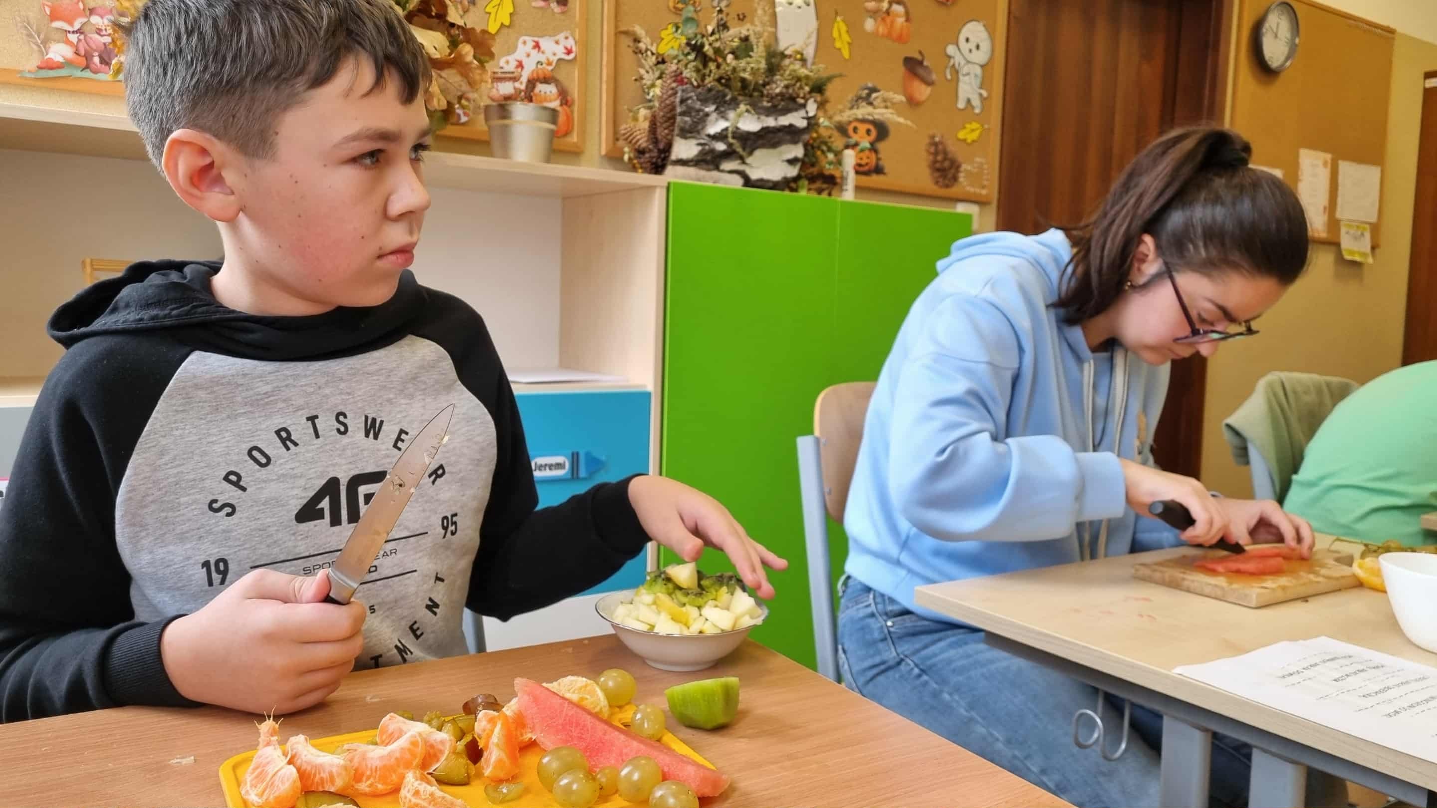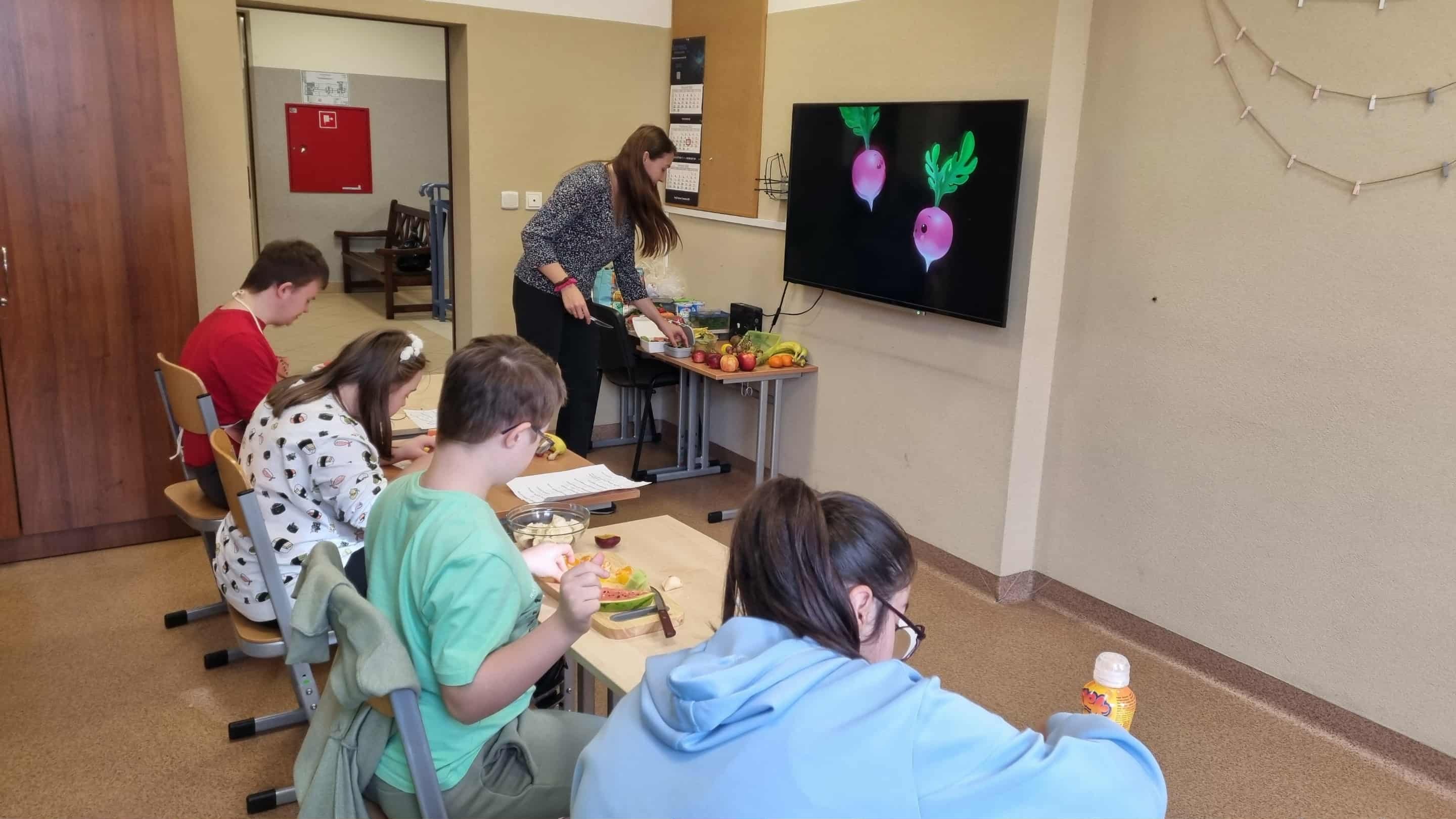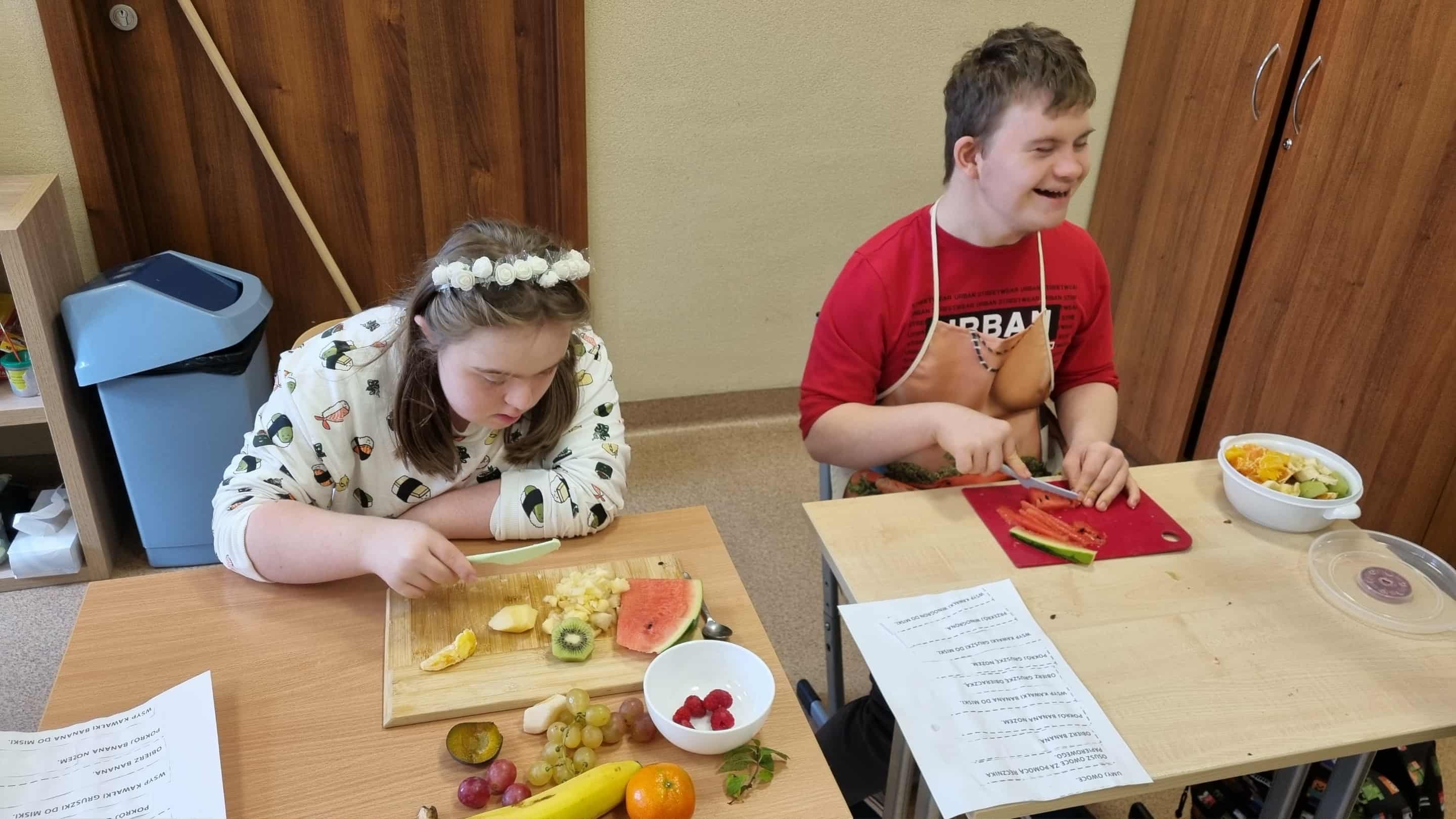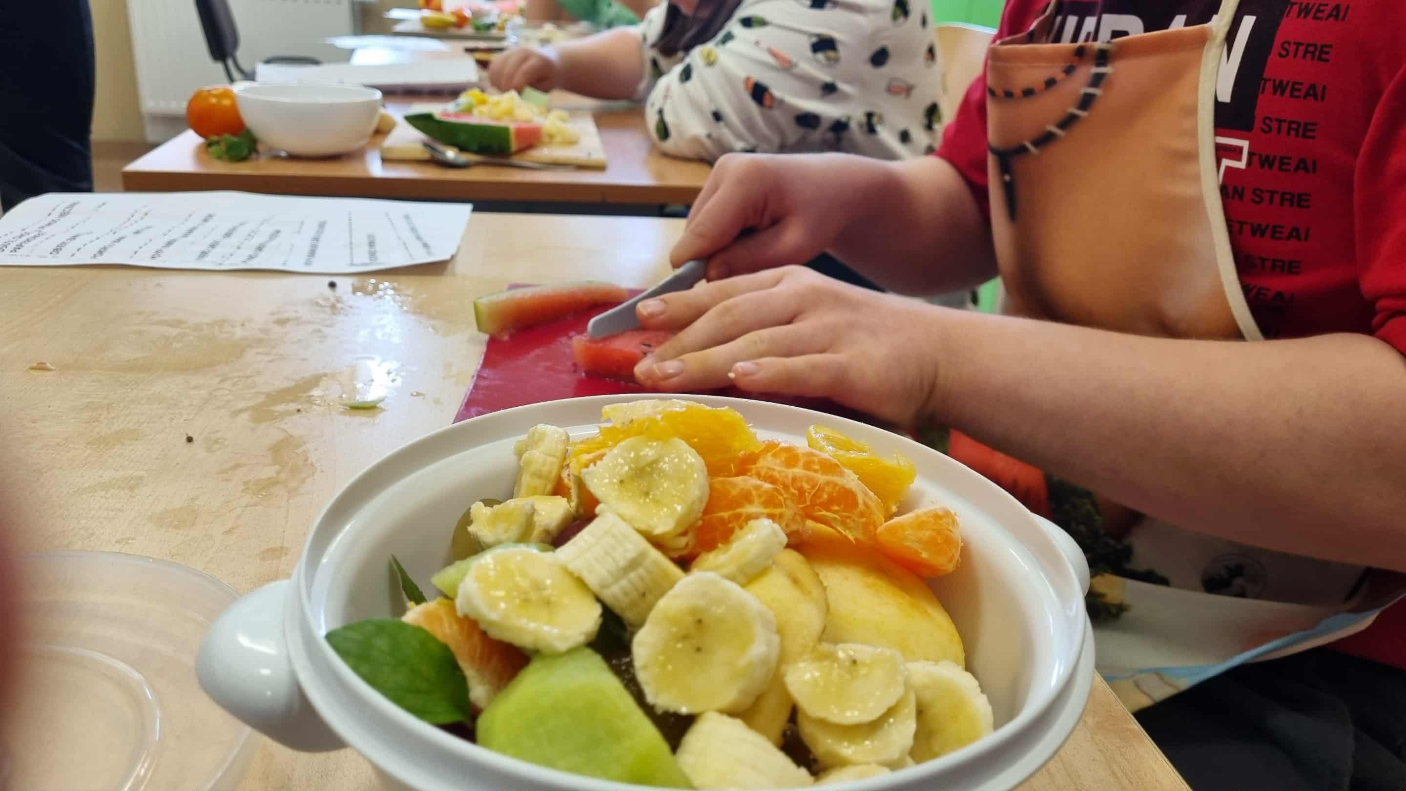 Następnie zabraliśmy się do pracy kulinarnej – przygotowywaliśmy pyszne, kolorowe sałatki owocowe i warzywne. Wszyscy z zaangażowaniem kroili, mieszali i dekorowali swoje potrawy, a na koniec wspólnie je degustowaliśmy. Było zdrowo, smacznie i bardzo wesoło!