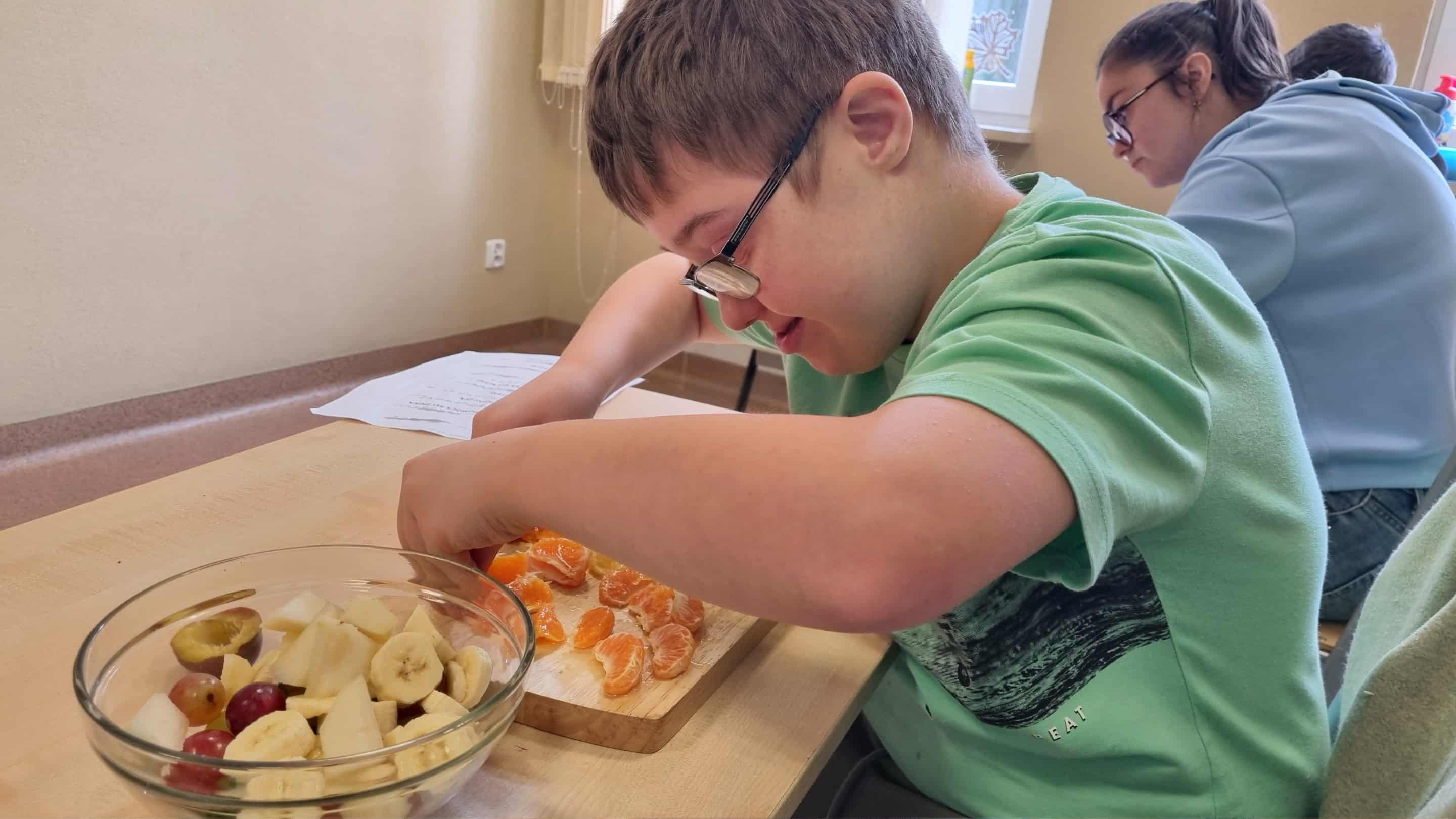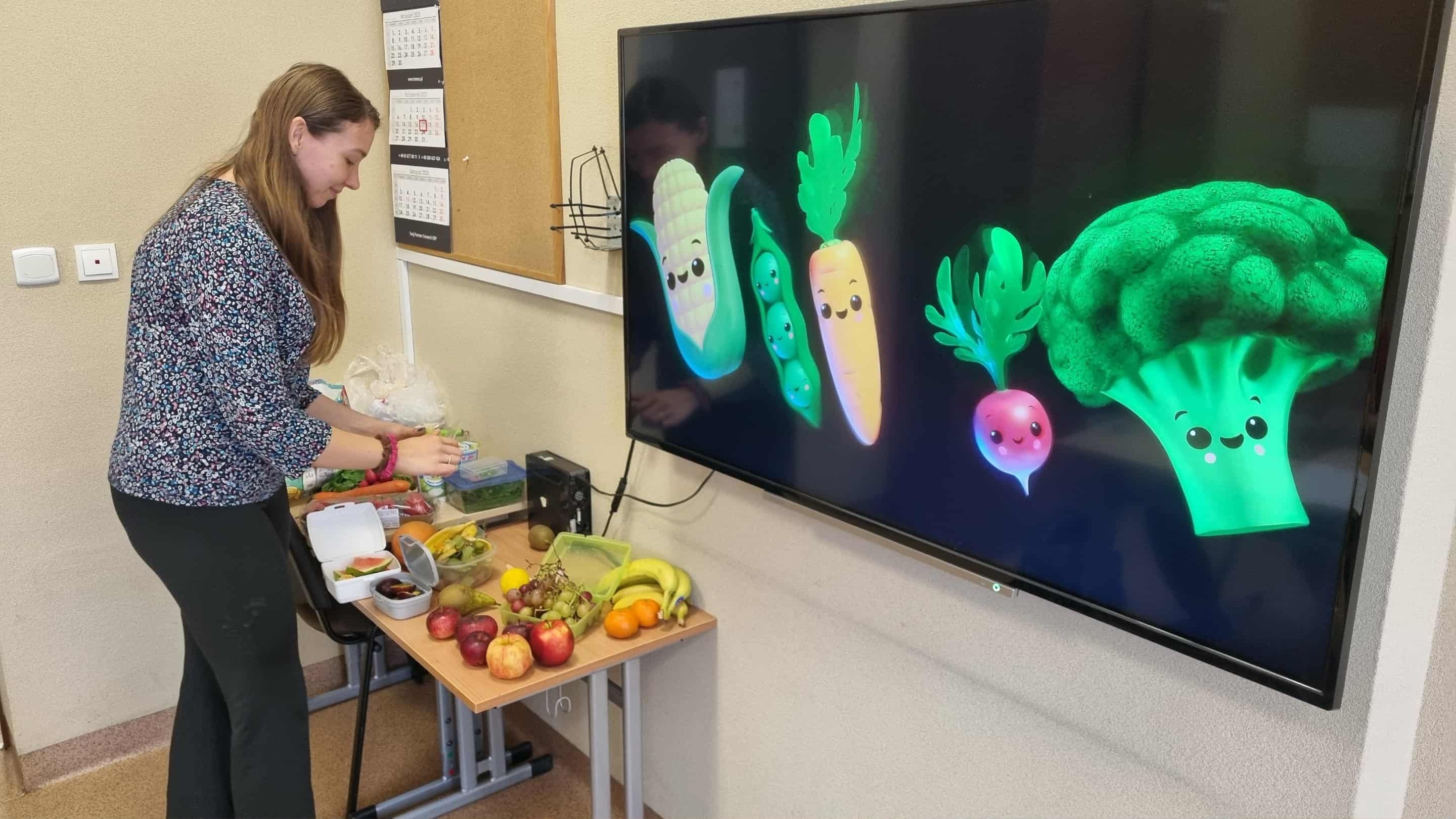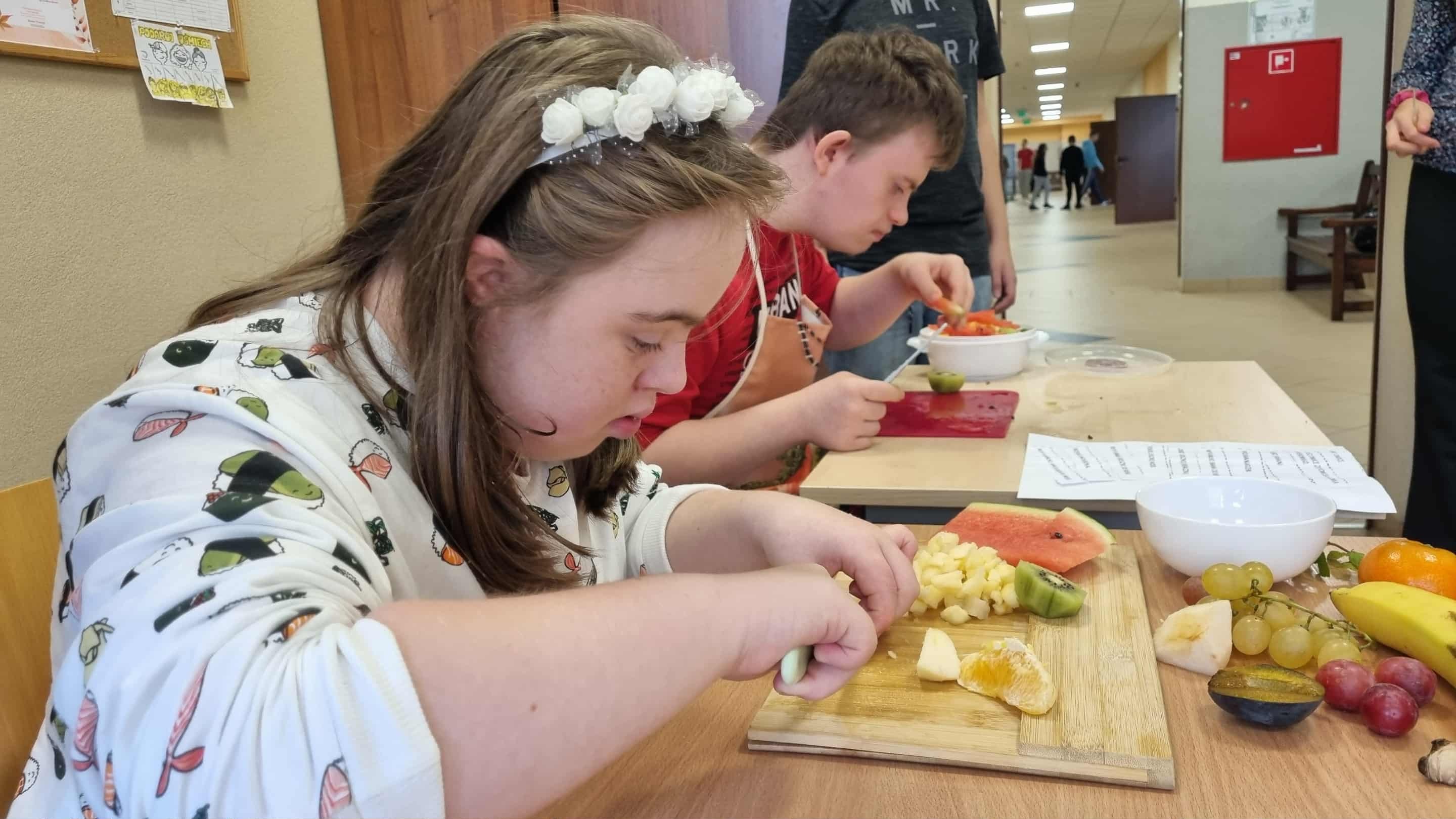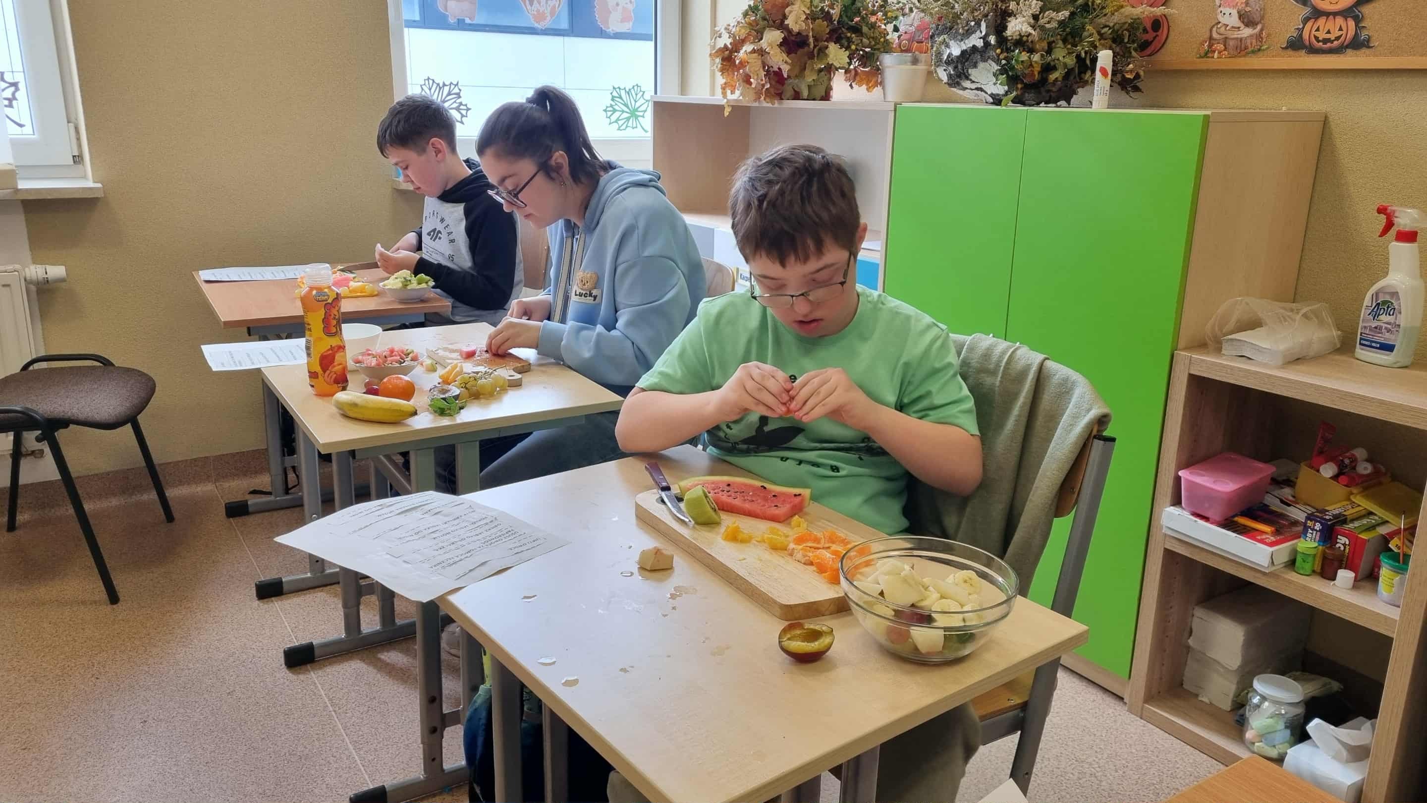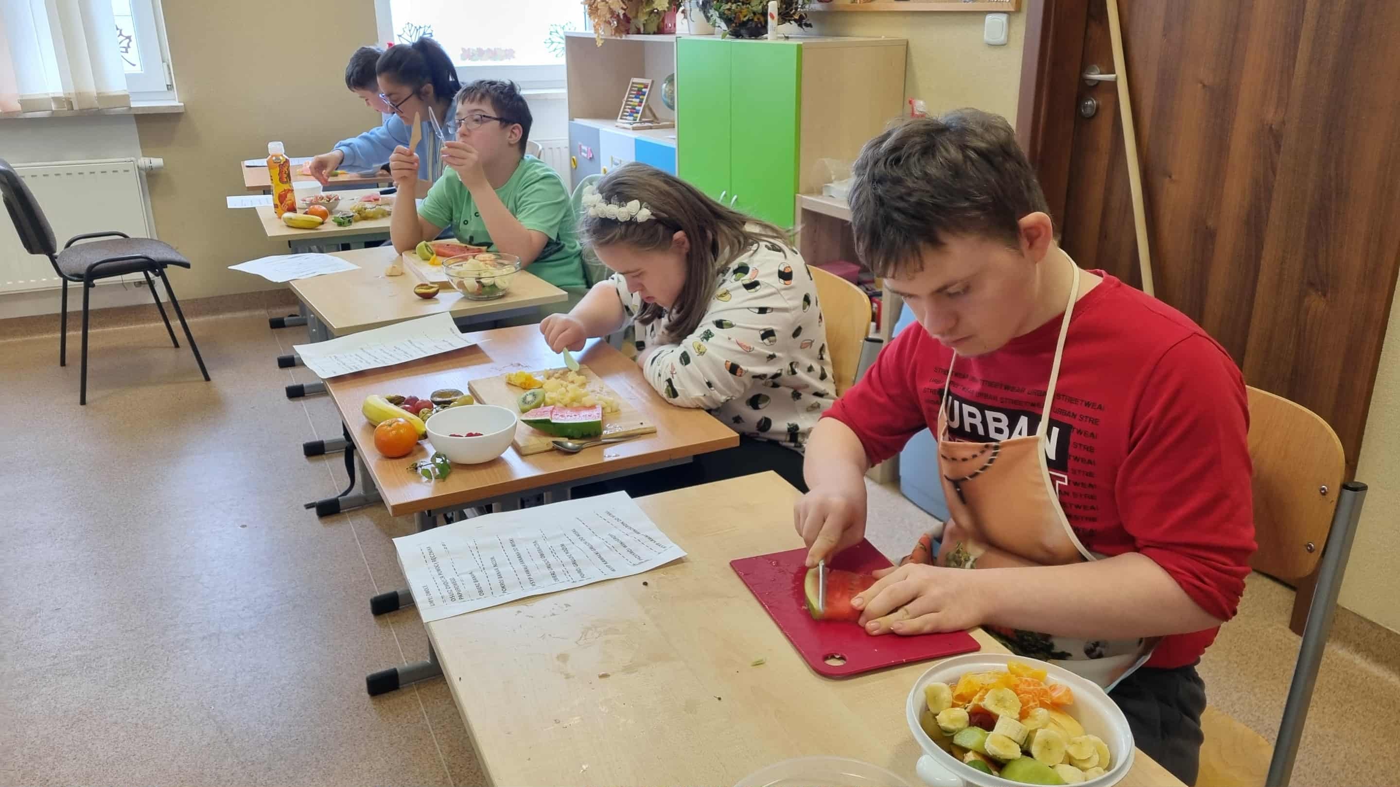 Następnie zabraliśmy się do pracy kulinarnej – przygotowywaliśmy pyszne, kolorowe sałatki owocowe i warzywne. Wszyscy z zaangażowaniem kroili, mieszali i dekorowali swoje potrawy, a na koniec wspólnie je degustowaliśmy. Było zdrowo, smacznie i bardzo wesoło!