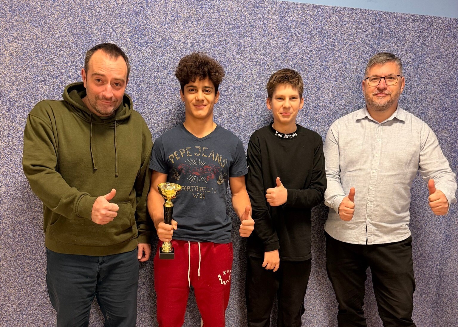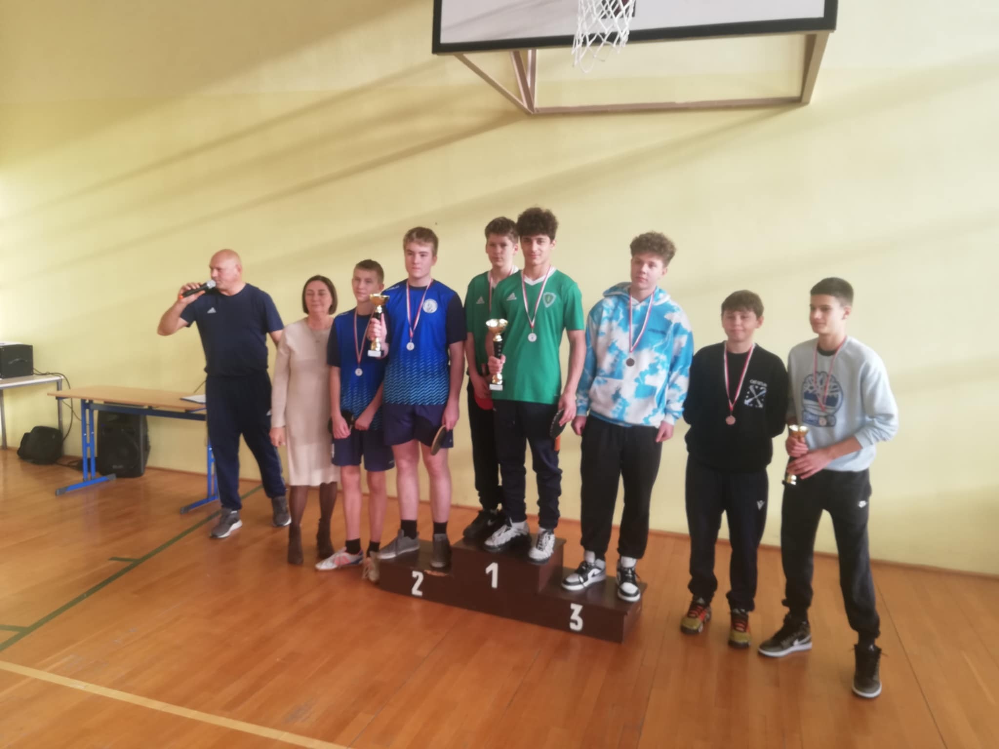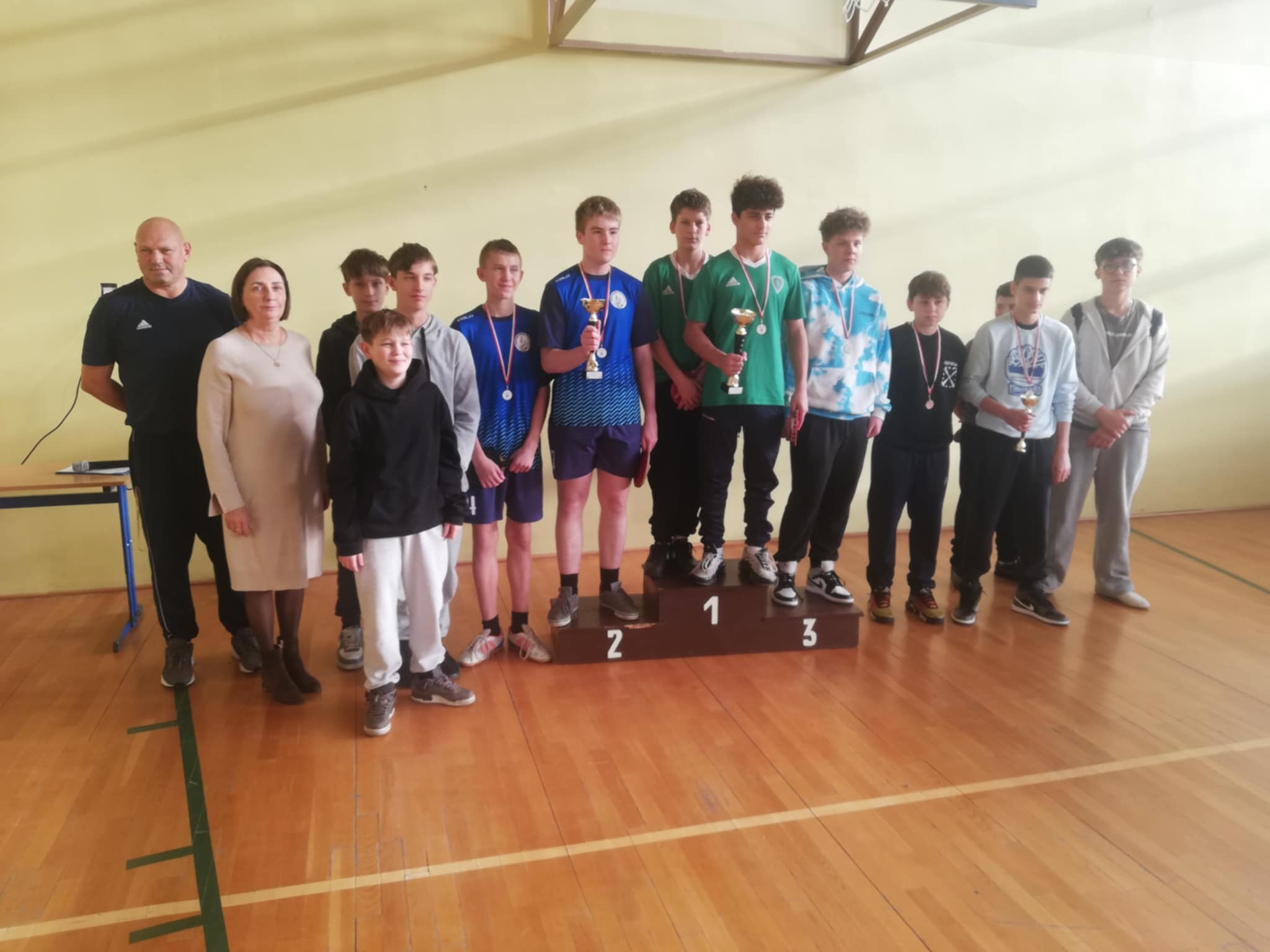Mate Kukuladze oraz Mateusz Bobrowski, uczniowie klasy VII wywalczyli dla naszej szkoły Mistrzostwo Powiatu Nowotomyskiego w Tenisie stołowym. Zawody w silnej obsadzie zorganizowano w Bolewicach. Mate i Mateusz wygrali wszystkie indywidualnie mecze, zdobywając Puchar Powiatu Nowotomyskiego oraz złote medale. Do zdjęcia z mistrzami chętnie pozowali dziś Panowie Dyrektorzy, gratulując sukcesu utytułowanym uczniom.